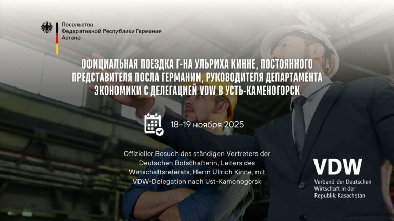 С 18 – 19 ноября 2025 г. состоится официальный визит постоянного представителя Посла, руководителя департамента экономики Посольства Федеративной Республики Германия г-на Ульриха Кинне в Усть-Каменогорск. С большим удовольствием приглашаем компаний-членов VDW сопровождать его в своей поездке.