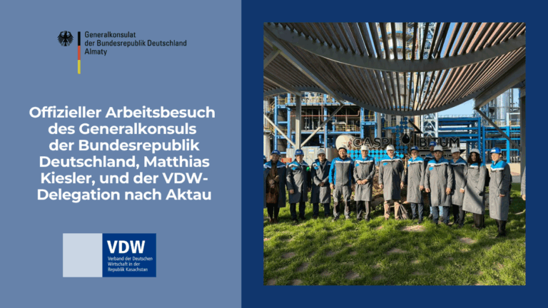Vom 5. bis 6. November 2025 organisierte der Verband der Deutschen Wirtschaft (VDW) erfolgreich den offiziellen Besuch des Generalkonsuls der Bundesrepublik Deutschland in Almaty, Herrn Matthias Kiesler, des stellvertretenden Botschafters und Leiters der Wirtschaftsabteilung der Deutschen Botschaft in Astana, Herrn Ulrich Kinne, sowie der sie begleitenden Delegation in der Stadt Aktau.